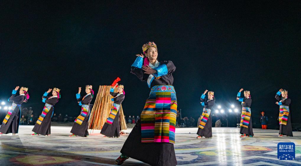 舞蹈演員在納木錯開湖篝火晚會現(xiàn)場表演(5月18日攝)。