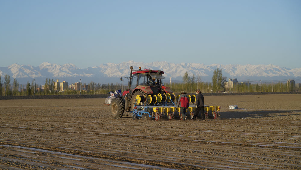 從哈衣繞拉管理的棉田向南望去,可見(jiàn)綿延起伏的天山山脈,終年不化的積雪、線條硬朗的山脊、若隱若現(xiàn)的云杉,像一幅氣勢(shì)磅礴的風(fēng)景畫(huà)。一臺(tái)高大的機(jī)器正按照北斗導(dǎo)航設(shè)計(jì)的路線筆直地行進(jìn),車(chē)尾安裝的自動(dòng)化播種設(shè)備將透明的薄膜、黑色的滴灌帶、紅色的包衣棉籽,一并整齊地埋進(jìn)褐色的泥土里。