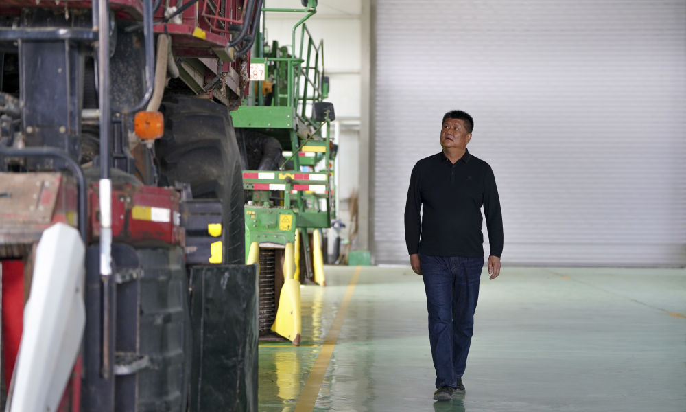2024年4月18日,在新疆沙灣市,韓波在農(nóng)機(jī)專(zhuān)業(yè)合作社車(chē)間查看農(nóng)機(jī)。