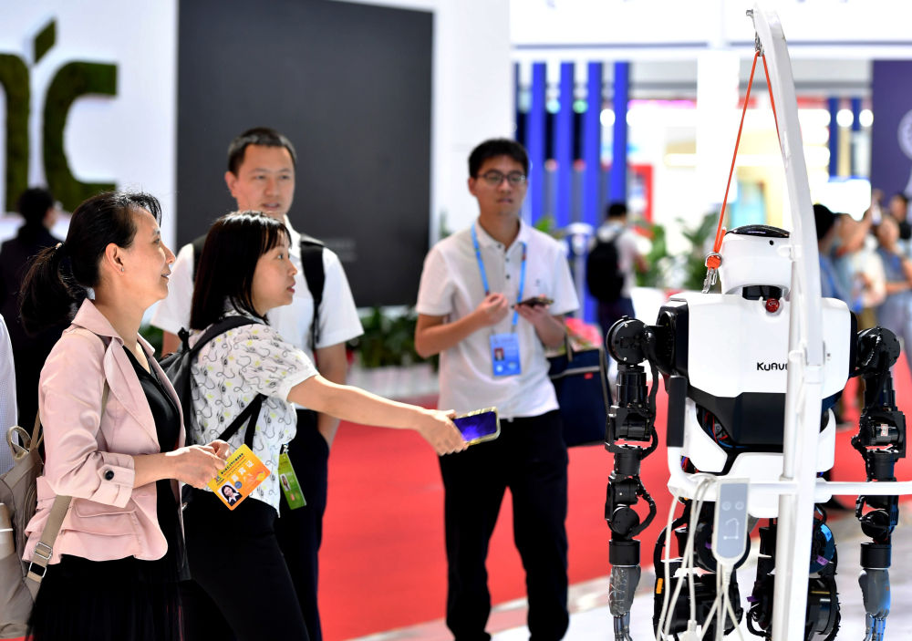 5月24日,在第七屆數(shù)字中國建設峰會現(xiàn)場體驗區(qū),觀眾在觀看“移動愛家機器人”。新華社記者魏培全攝