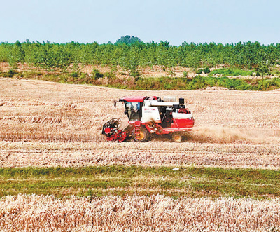 一片金黃的麥田里,撥禾輪轉(zhuǎn)動,麥芒飛揚(yáng),麥粒傾瀉而下……就在23日,蔡華從早忙到晚,沒敢停歇:“預(yù)報(bào)有雨,我得趕緊把客戶家的80多畝地收完?!碧烊谙聛恚虐咽崭顧C(jī)停進(jìn)車棚,麥香味瞬間涌進(jìn)小院。累了一整天,剛吃完飯,蔡華又和妻子張秀蘭盤算起出發(fā)的行頭:對講機(jī)、收款二維碼……