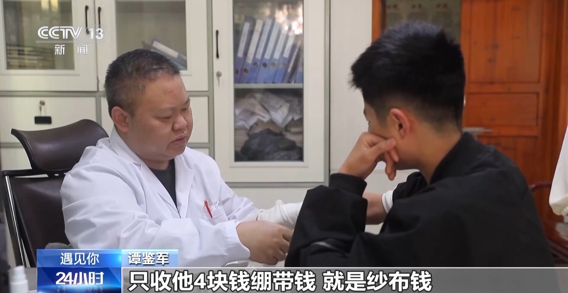 譚鑒軍:這個(gè)小段,我剛剛給他檢查了,只收他4塊錢紗布錢。學(xué)生脫臼、骨折、腳崴,我們會給他進(jìn)行手法復(fù)位,但是我們從來不收錢,還有小學(xué)、幼兒園的學(xué)生很喜歡玩彈珠,塞到鼻子上,我們每次取完也不收錢的。