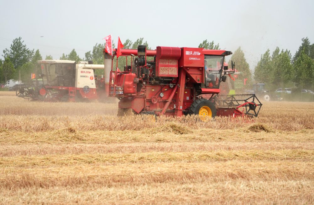 6月2日,在山東省臨沂市郯城縣廟山鎮(zhèn),參加小麥機收減損技能大比武的農機手駕駛聯(lián)合收割機收獲小麥。 新華社記者 徐速繪 攝