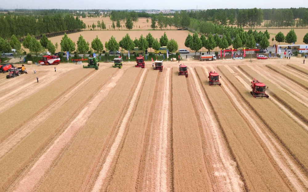 麥浪翻滾,沃野生金。麥田中,10臺收割機依次排開;一聲令下,農機手駕駛收割機勻速前行,風中搖曳的麥穗被吸入“腹中”,田間只剩下短短的麥茬。