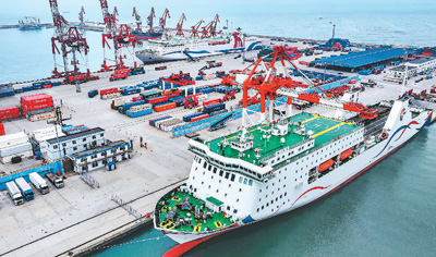 今年以來(lái),山東省榮成市石島管理區(qū)通過(guò)推廣“海運(yùn)直航+跨境電商+海外倉(cāng)”等發(fā)展模式,全力做好貨物承攬。圖為日前,石島新港口岸,貨輪在裝卸集裝箱貨物。
