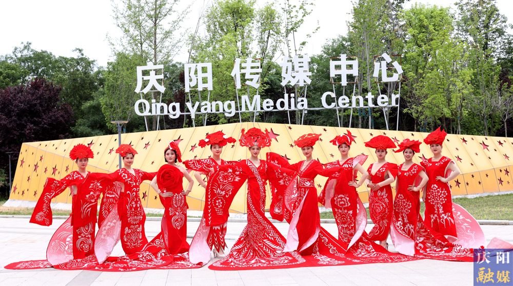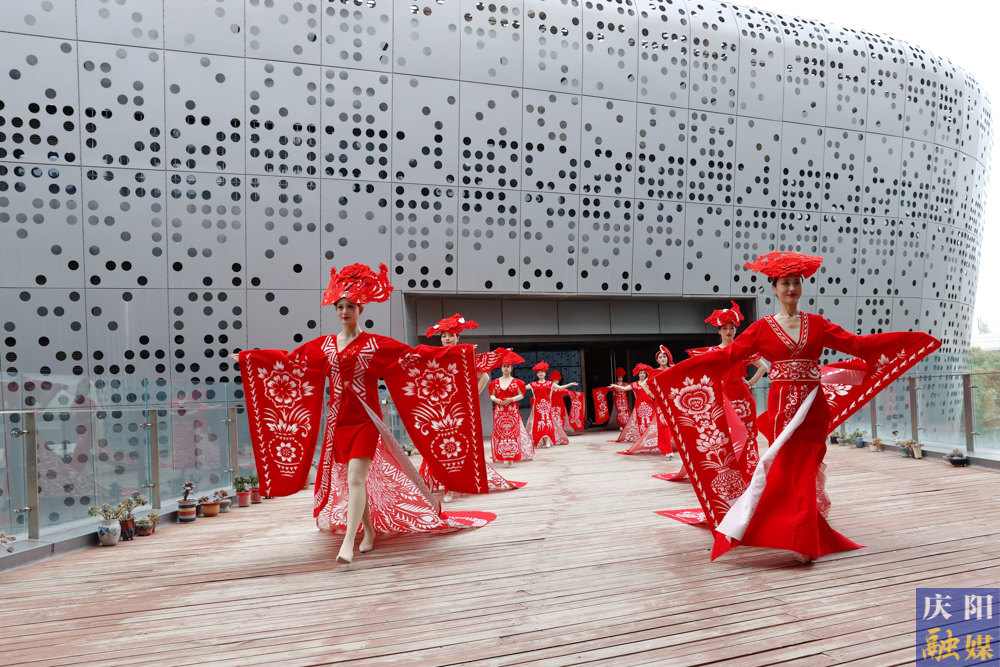 主播們身著刻鏤龍紋、鳳紋、抓髻娃娃、生命樹、魚鉆蓮、牡丹等剪紙紋樣,大V領(lǐng)、魚尾裙、聳肩收腰的“剪云裳”剪紙服裝,行走在傳媒大廈、西峰區(qū)彩虹橋、慶陽市城市海綿運(yùn)動(dòng)綠地等處,全方位、多角度地展示了剪紙服裝的特色與魅力。