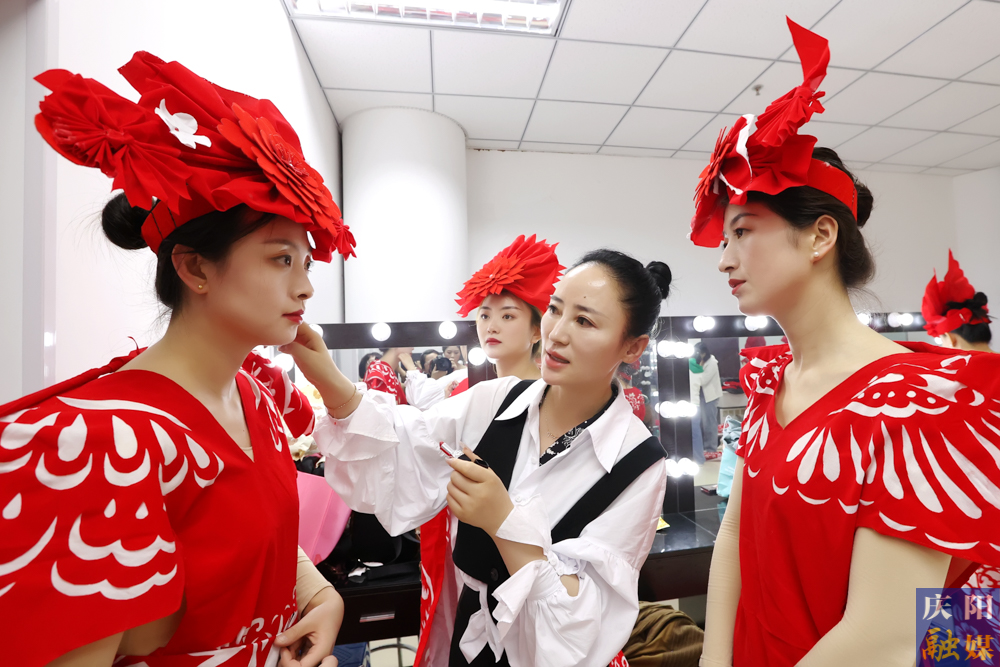 鎮(zhèn)原縣文化館館長、“剪云裳”慶陽剪紙系列服裝設(shè)計(jì)者常燕為模特打理造型。