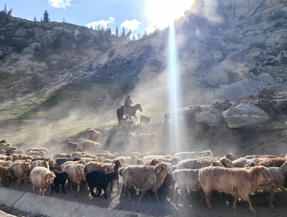 這是6月5日拍攝的新疆阿勒泰地區(qū)富蘊縣山中的羊群。新華社記者 楊皓 攝