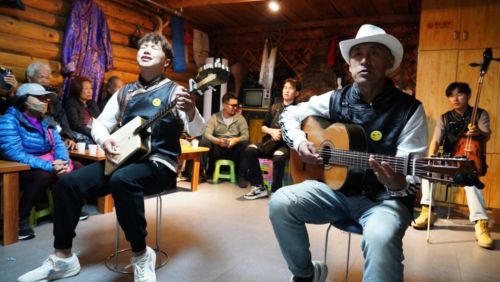 6月2日,在新疆喀納斯景區(qū)家訪點,樂隊歌手為游客演唱。新華社記者 阿曼 攝
