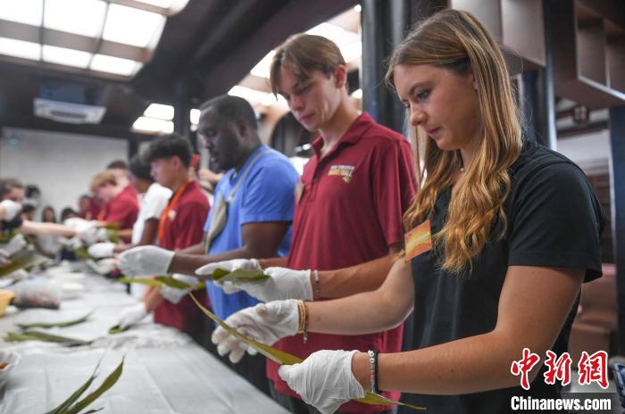 在阿姨們手把手教學(xué)下,來自O(shè)aks Christian High School的Beckemeyer Christopher Townsend包了自己人生中的第一個粽子,“挺有意思的,剛開始練習(xí)其實(shí)不會裹粽葉,但是對我們來說是非常有趣的一個經(jīng)歷。”