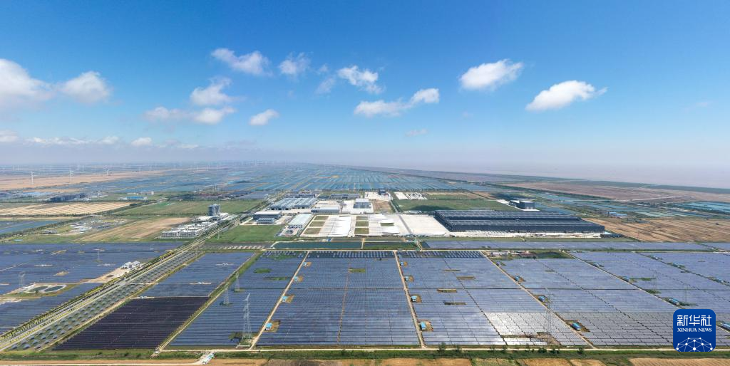 6月6日在射陽港低(零)碳產(chǎn)業(yè)園拍攝的長廊頂部太陽能光伏系統(tǒng)(無人機(jī)照片)。新華社記者 楊磊 攝
