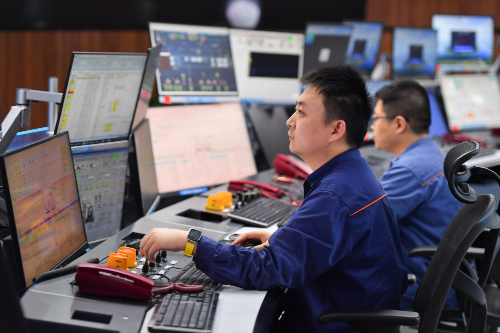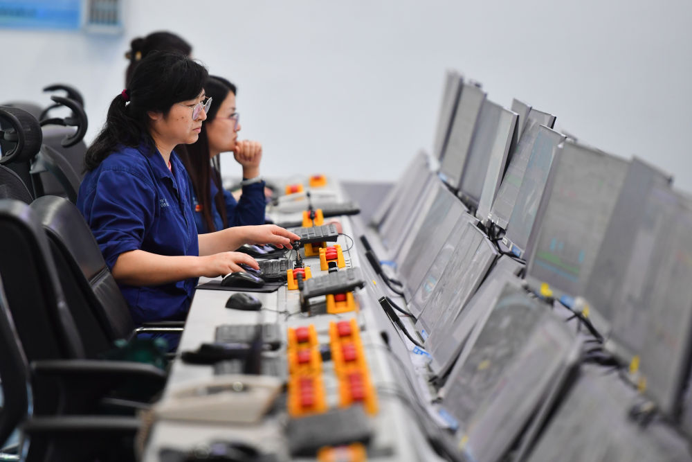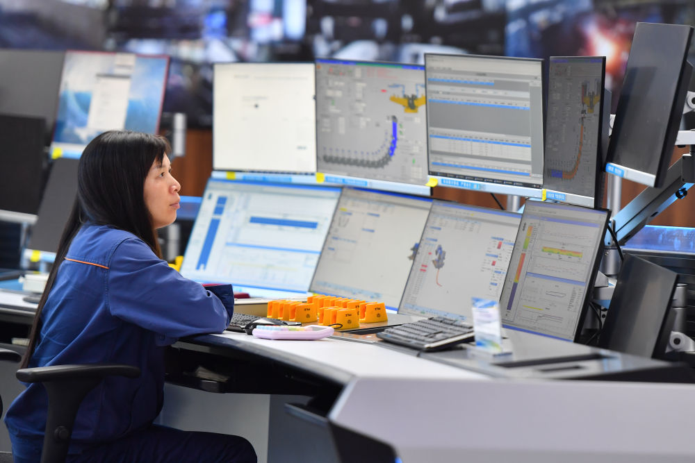 2024年6月13日,在位于湖南省湘潭市的湘潭鋼鐵集團(tuán)有限公司五米寬厚板廠智慧中心,工作人員在遠(yuǎn)程操作加熱爐設(shè)備。五米寬厚板廠智慧中心利用超融合、虛擬化、5G傳輸以及分布式計算和存儲等技術(shù),將五米板煉鋼、軋鋼和熱處理全工序的控制和二級、三級系統(tǒng)進(jìn)行整合,改善工人的工作環(huán)境,提高生產(chǎn)的自動化程度和效率。新華社記者 陳澤國 攝