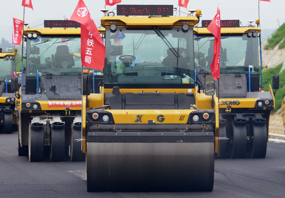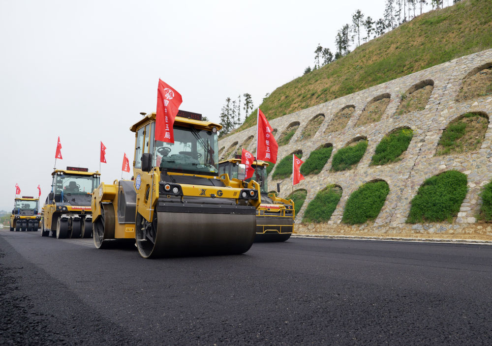 2024年4月11日,在河南省新縣,無人駕駛壓路機在由中鐵五局承建的沿大別山高速公路雞公山至商城段進(jìn)行施工作業(yè)。 新華社記者 李嘉南 攝