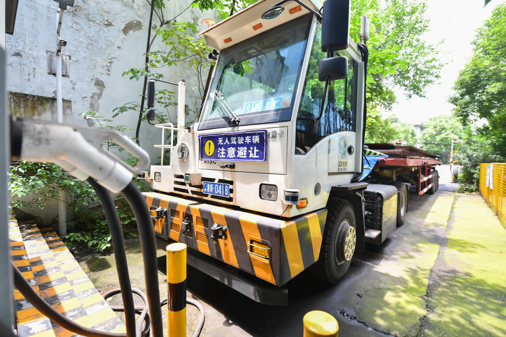 2024年6月13日,在湖南省湘潭市,一臺碼頭無人牽引車??吭谙嫣朵撹F集團(tuán)有限公司的充電站。碼頭無人牽引車?yán)?G通信和北斗定位技術(shù),結(jié)合激光雷達(dá)和相機等傳感器對周圍的環(huán)境進(jìn)行動態(tài)的高精度建模,實時獲取牽引車與掛車的相對位置信息和環(huán)境信息。 新華社記者 陳澤國 攝