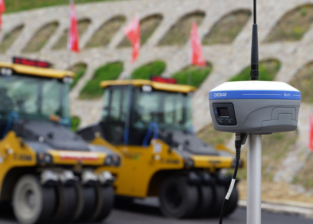 2024年4月11日,在河南新縣境內(nèi)的沿大別山高速公路雞公山至商城段,基準(zhǔn)站在為作業(yè)中的無人駕駛壓路機提供定位坐標(biāo)。 新華社記者 李嘉南 攝