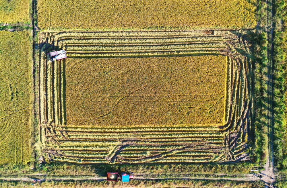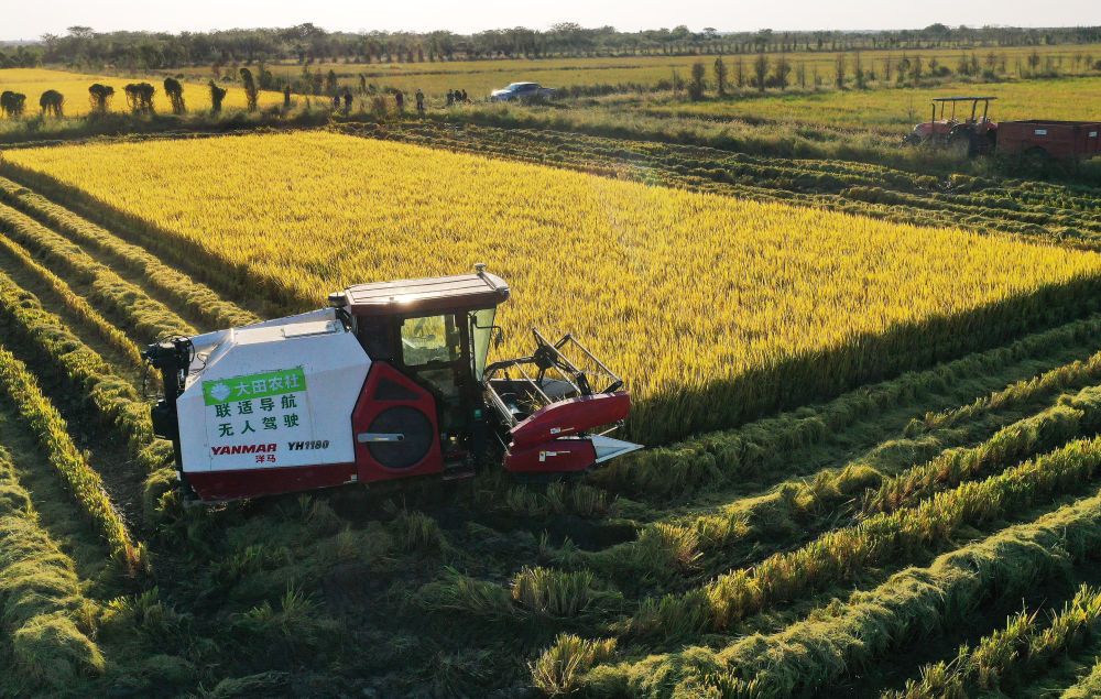 2022年10月11日,在江西省南昌縣大田農(nóng)社,無人駕駛收割機在收割成熟的水稻。無人駕駛收割機裝有精準(zhǔn)導(dǎo)航系統(tǒng),提高了收獲精度,降低了糧食損耗。 新華社記者 萬象 攝