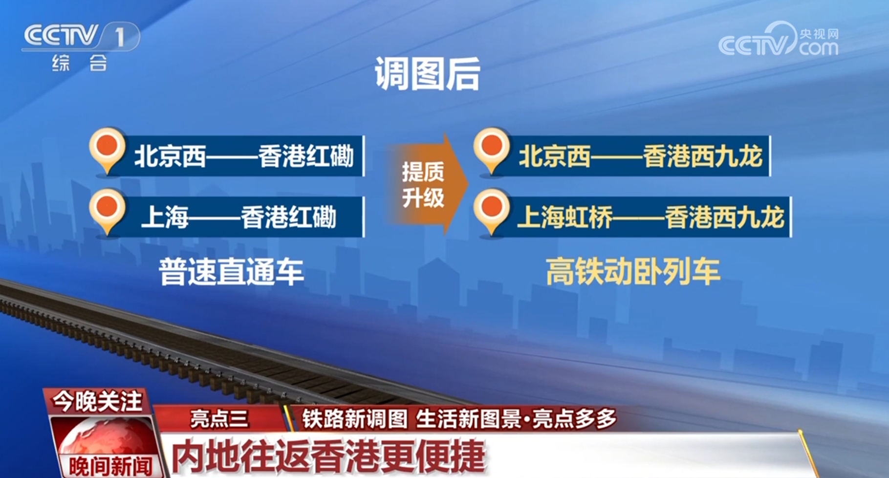 調(diào)圖后,北京西、上海與香港紅磡站間開行的普速直通車,提質(zhì)升級(jí)為北京西、上海虹橋與香港西九龍站間的高鐵動(dòng)臥列車。北京至香港的全程旅行時(shí)間由原來(lái)的24小時(shí)31分壓縮至12小時(shí)34分,上海到香港從19小時(shí)34分壓縮至11小時(shí)14分。京港、滬港間實(shí)現(xiàn)夕發(fā)朝至,動(dòng)臥的出行方式更可省去一晚酒店費(fèi)用。