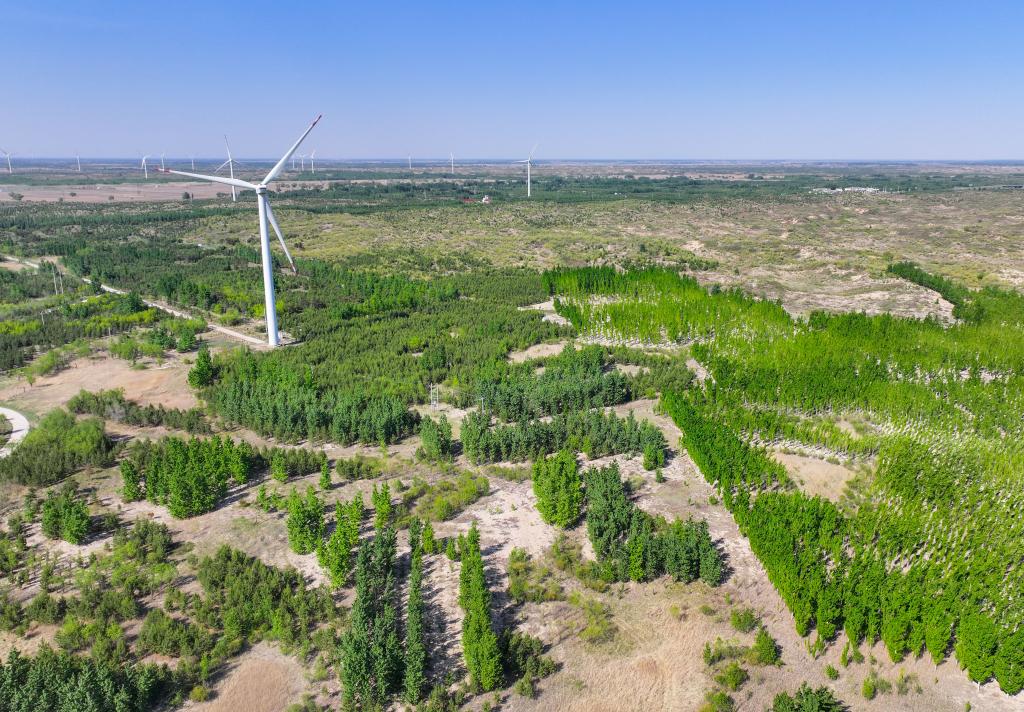 這是在內(nèi)蒙古通遼市科爾沁沙地“雙百萬畝”綜合治理工程努古斯臺項目區(qū)拍攝的風力發(fā)電機組(2024年5月15日攝,無人機照片)。新華社記者 連振 攝