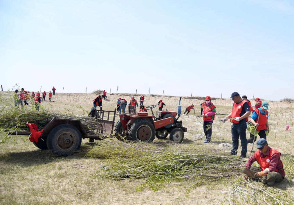 2024年5月6日,在地處渾善達克沙地的內(nèi)蒙古錫林郭勒盟正藍旗寶紹岱蘇木扎魯特嘎查,志愿者們開展植綠活動。新華社發(fā)(巴依斯古楞 攝)