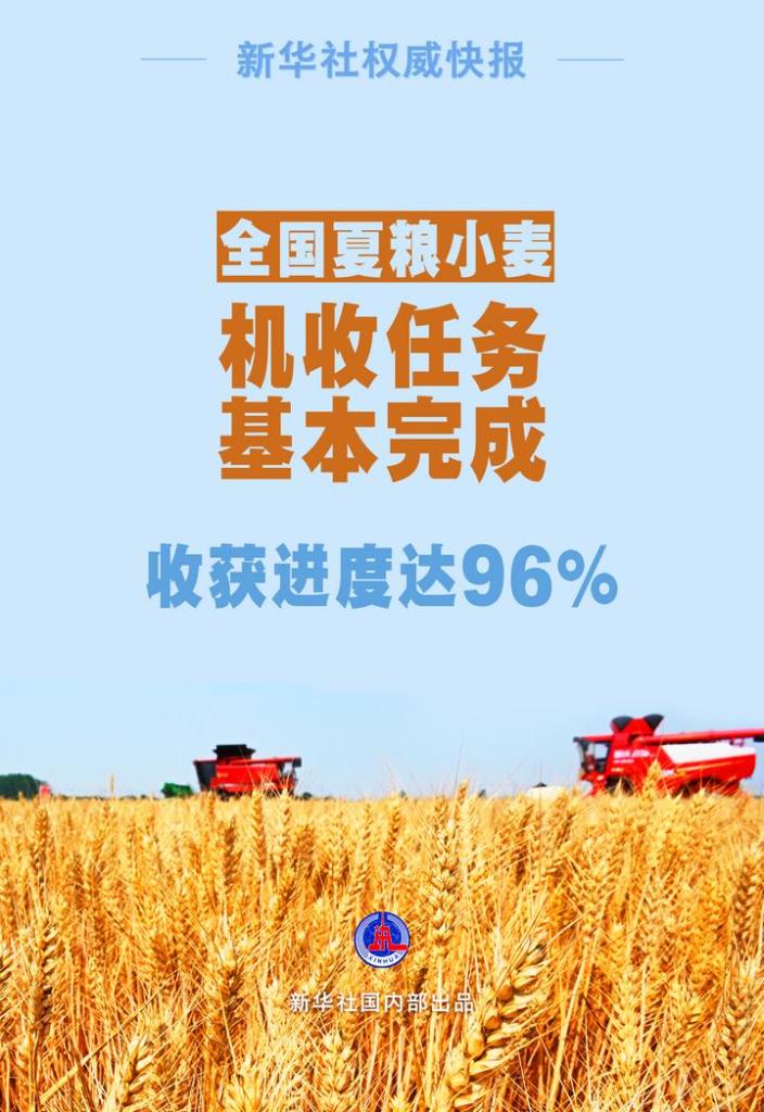 目前,全國夏糧小麥?zhǔn)斋@進度已達(dá)96%,“三夏”小麥機收任務(wù)基本完成。