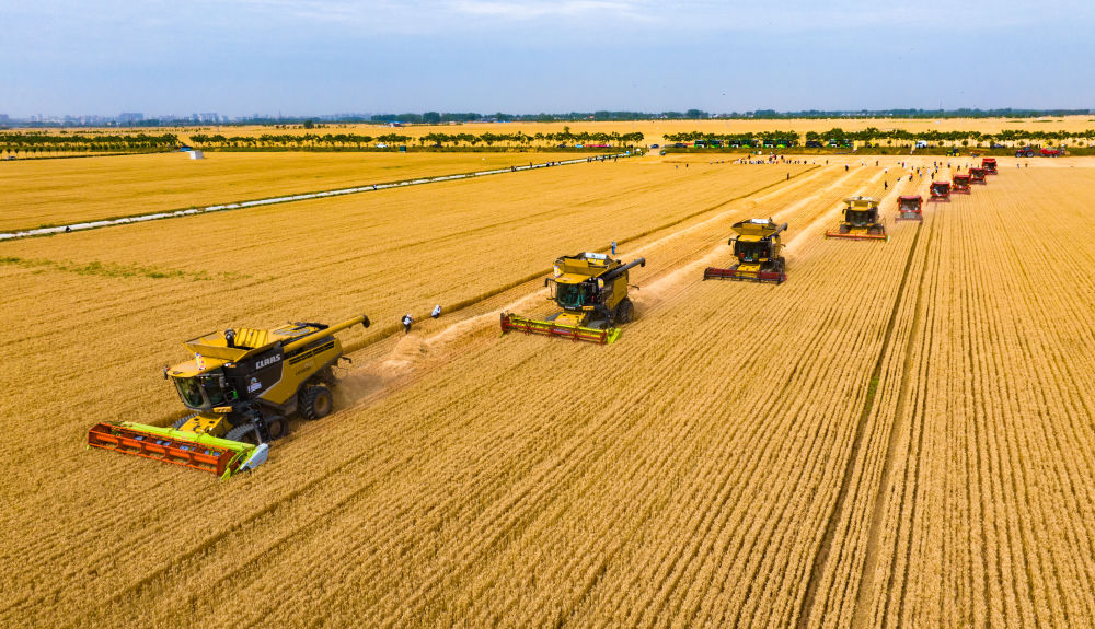 5月29日,在河南省駐馬店市西平縣老王坡高標(biāo)準(zhǔn)農(nóng)田,當(dāng)?shù)胤N糧大戶聯(lián)合農(nóng)機(jī)合作社舉行小麥開鐮收割儀式。這是機(jī)收編隊在收獲小麥。新華社發(fā)(趙永濤攝)