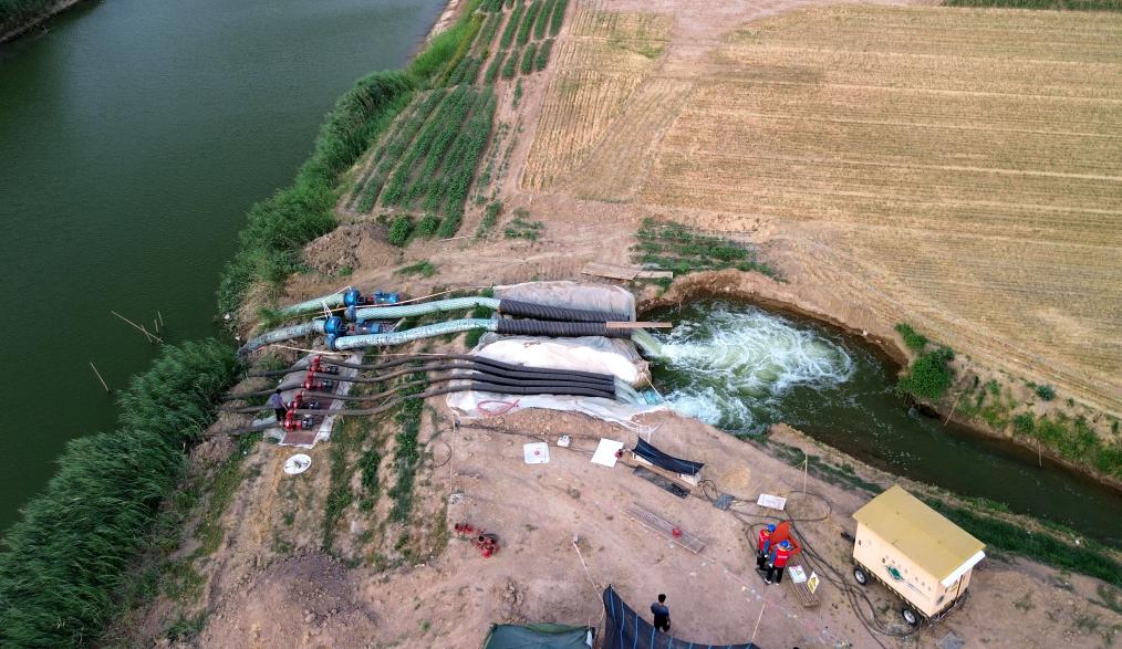 6月18日,在山東省巨野縣麒麟鎮(zhèn)的一處抗旱應(yīng)急取水點,水泵正在抽水輸入農(nóng)田灌溉渠道(無人機(jī)照片)。新華社記者 徐速繪 攝