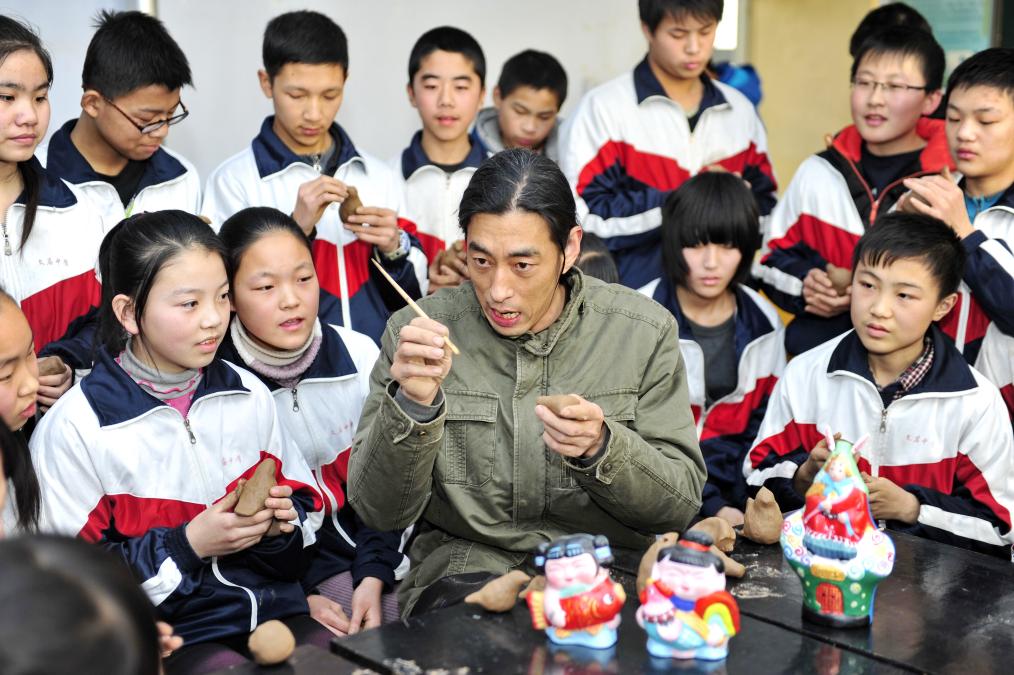 2015年1月9日,在河北省泊頭市文廟中學(xué),“三癡齋”泥塑傳承人宋長峰(前中)在教學(xué)生們制作鳥哨。