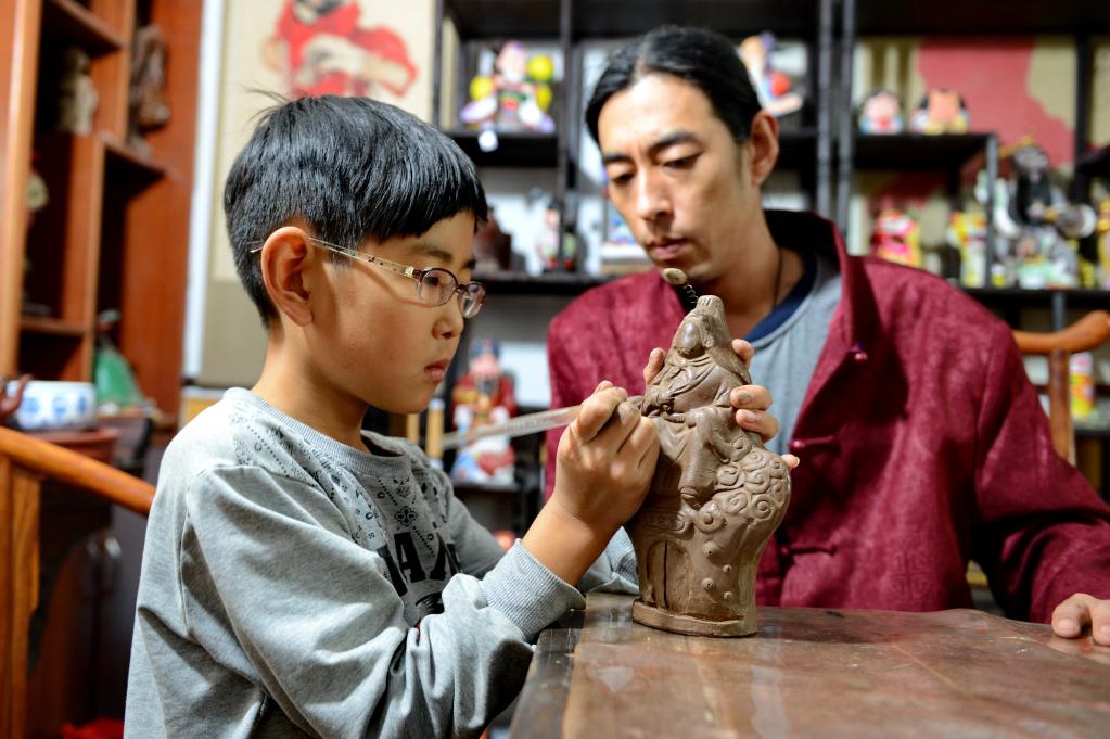 2014年10月22日,“三癡齋”泥塑傳承人宋長峰指導(dǎo)兒子進(jìn)行泥塑制作。