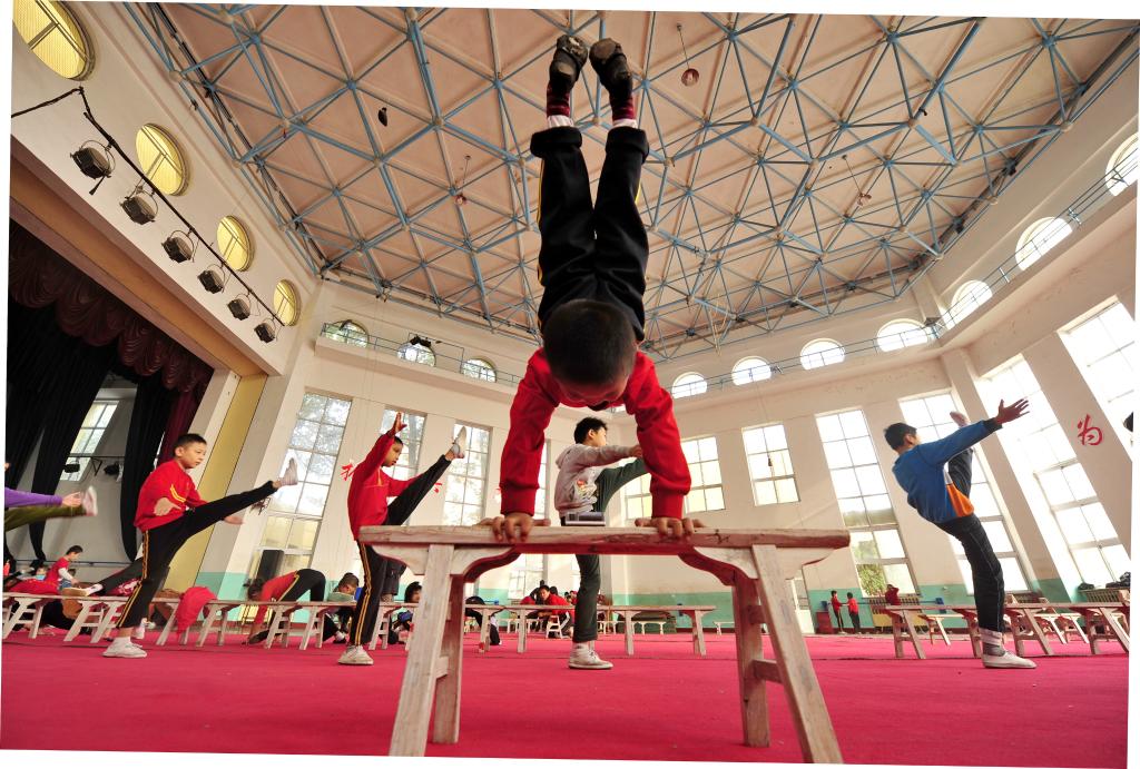 2014年10月24日,吳橋國際雜技藝術(shù)學(xué)校的學(xué)生們在練功。