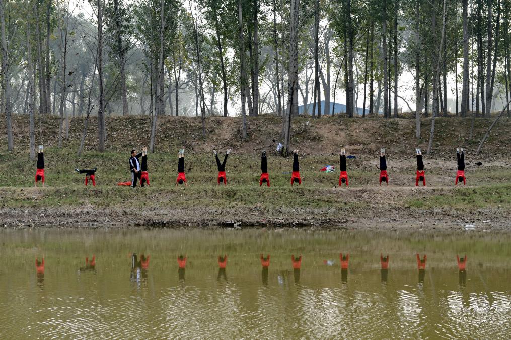 2014年10月24日,吳橋國際雜技藝術(shù)學(xué)校的學(xué)生們在大運河邊練功。