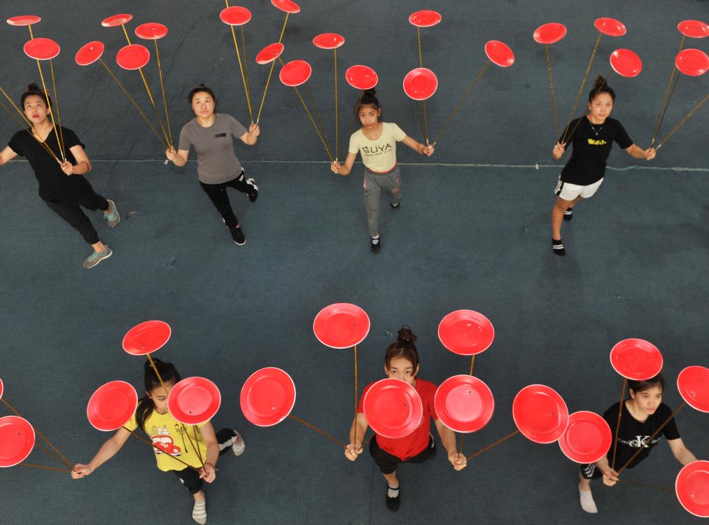 2018年7月30日,來自老撾的留學(xué)生們在吳橋雜技藝術(shù)學(xué)校內(nèi)練習(xí)轉(zhuǎn)碟。