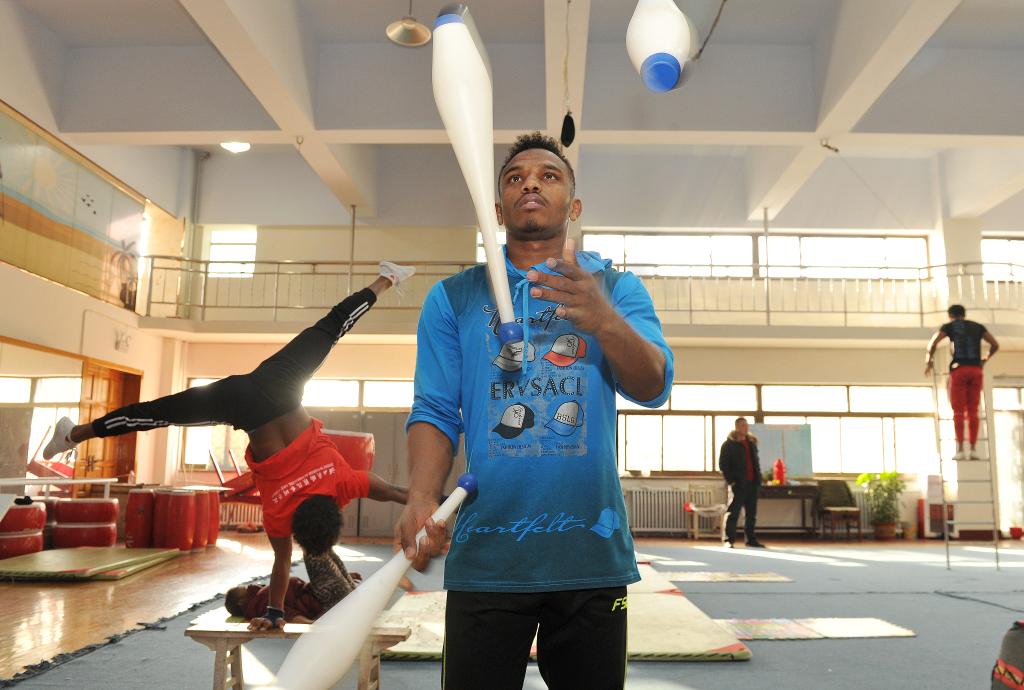 2018年1月25日,在吳橋雜技藝術(shù)學(xué)校,來自埃塞俄比亞的留學(xué)生依布薩(中)在練習(xí)雜技。