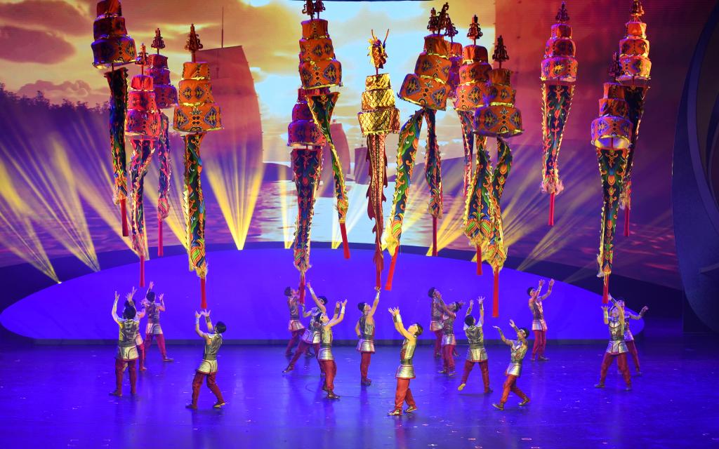 2023年10月25日,在第十九屆中國吳橋國際雜技藝術(shù)節(jié)上,中國雜技演員在表演《龍躍神州——中幡》。