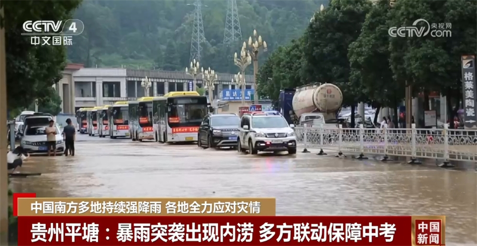 受強降雨的影響,23日,貴州平塘縣低洼路段出現(xiàn)內澇。恰逢當?shù)刂锌甲詈笠惶欤瑸楸U蠈W生順利參考,平塘縣第一時間啟動應急預案,引導接送考生車輛安全行駛。