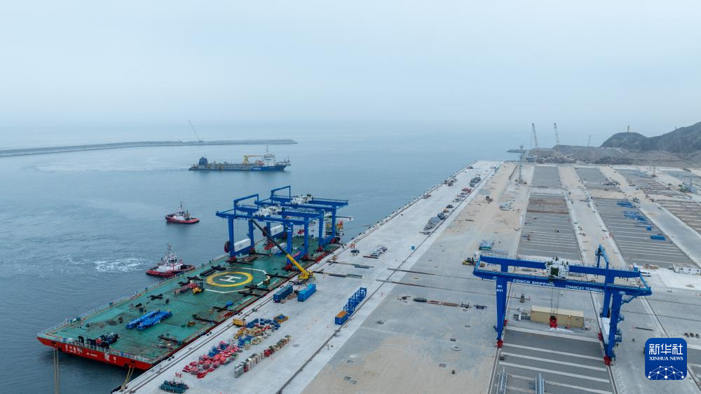 由中企控股和投資開發(fā)的錢凱港位于秘魯首都利馬以北的錢凱灣內(nèi)。從空中俯瞰,約2.6公里長(zhǎng)的防波堤像巨臂一般環(huán)抱住碼頭設(shè)施,以阻擋太平洋海浪的侵蝕。