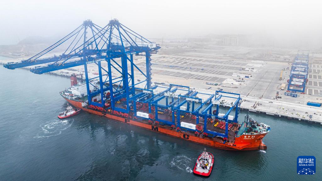 6月27日,岸邊集裝箱起重機(jī)和軌道吊運(yùn)抵秘魯錢凱港。 新華社發(fā)(上海振華重工供圖)