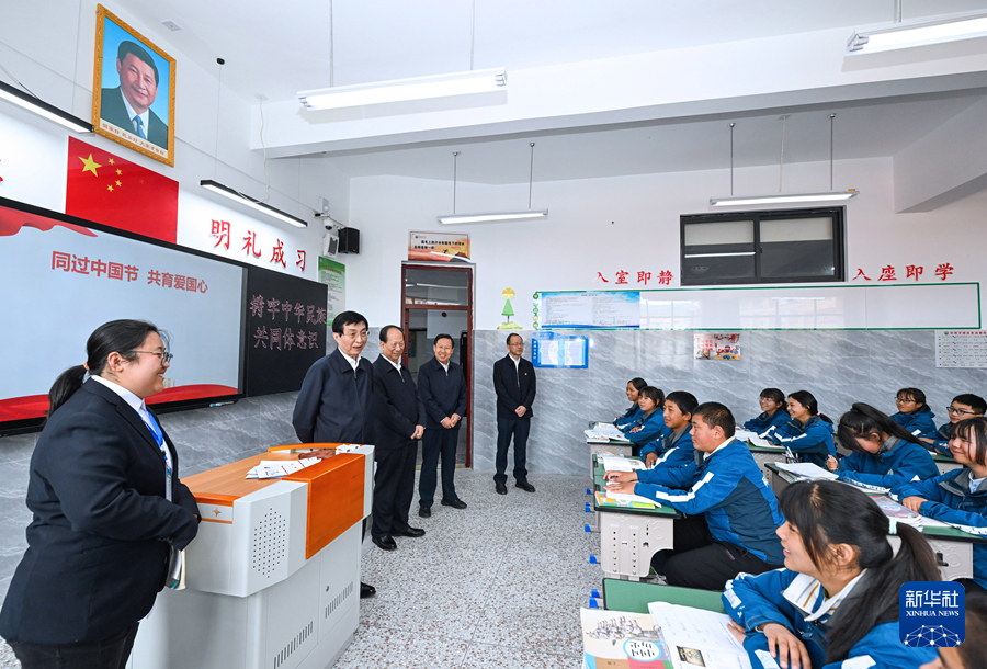 7月1日至3日,中共中央政治局常委、全國政協(xié)主席王滬寧在四川甘孜、阿壩調研。這是7月3日王滬寧在阿壩縣中學了解開展愛國主義教育和民族團結進步教育情況。新華社記者 饒愛民 攝