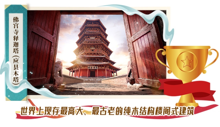 應縣木塔建于遼清寧二年(公元1056年),與意大利比薩斜塔、法國巴黎埃菲爾鐵塔并稱“世界三大奇塔”。采用純木結構搭建,全塔無釘無鉚。全塔使用的斗拱形式達50余種,有“斗拱博物館”之稱。