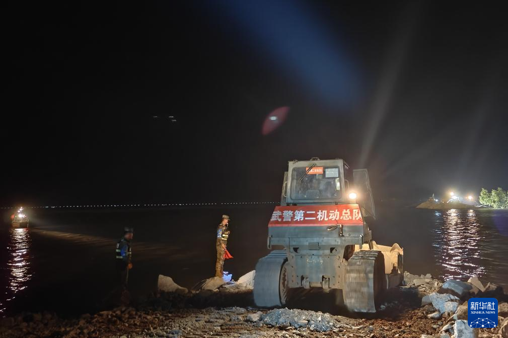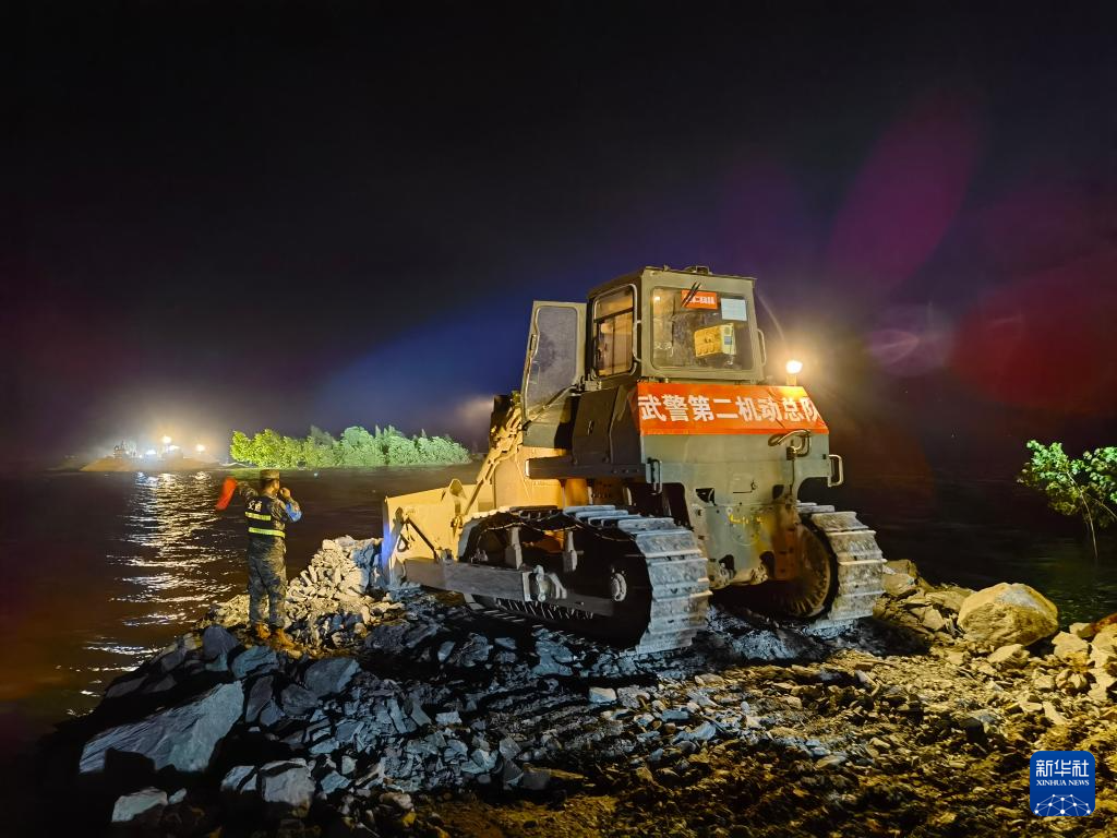 7月7日凌晨,在湖南省岳陽市華容縣團(tuán)洲垸洞庭湖一線堤防決口處,武警部隊官兵操縱工程機(jī)械封堵決口。新華社記者 李秉宣 攝