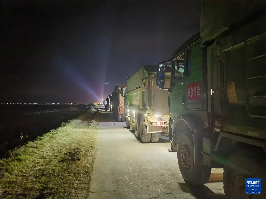 時間指向凌晨4點(diǎn),通向決口的公路上,滿載石料的卡車、工程車輛仍然排著“長龍”,蜿蜒3公里長,機(jī)械的轟鳴聲響徹大堤。