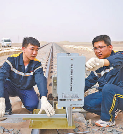 臺欣龍(右)和同事在對紅外線軸溫探測設(shè)備探頭進行方位角矯正。