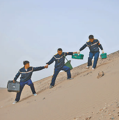 班組成員在翻越沙丘。 2014年,烏魯木齊西車輛段哈密動態(tài)檢測車間哈羅班組正式成立,負責(zé)維護哈羅鐵路沿線設(shè)備。10年來,哈羅班組堅守在環(huán)境惡劣、條件艱苦的羅布泊,克服重重困難,做好鐵路巡檢和故障維修,保障鉀肥運輸。 羅布泊,位于新疆東南部塔克拉瑪干沙漠邊緣,天上無飛鳥,地上不長草,只有漫無邊際的沙漠、戈壁、鹽堿灘。 這里一年中有200多天風(fēng)沙肆虐,夏季氣溫超過50攝氏度,冬季氣溫低至零下30攝氏度。這里是中國鐵路烏魯木齊局集團有限公司烏魯木齊西車輛段哈密動態(tài)檢測車間哈羅班組工作的地方。 是什么讓他們選擇到羅布泊工作?又是什么工作值得他們在這里堅守10年? “鐵路修到哪兒,人員就要配到哪兒” 嗚—— “火車進站了,快!” 哈羅班組工長臺欣龍和伙伴們沖向站臺,幾個人一下子堵在了車門前。 “老吳,這回有啥?” “今兒有羊肉、雞蛋,還有一袋子番茄?!?/p> “嘿嘿嘿?!?/p> 車門旁,幾個大小伙兒咧著嘴憨笑。 臺欣龍工作的地方,叫羅中站,是哈羅鐵路的最后一站,地處羅布泊中心。這里雖通了電、通了水,但米、面、糧、油、飲用水等生活物資全靠火車從400公里外的哈密市送來。 “大小伙兒們,自己搬水。”列車長老吳一聲令下,臺欣龍和伙伴們麻利地爬上車,一人扛下一桶15升的礦泉水。 “這兒的水堿性大,一燒開,全是白粒粒,沒法喝?!迸_欣龍說,這15升礦泉水得撐一周。 在羅中站,差不多每隔5天會有通勤列車抵達,送來各類物資。 列車停留5小時,隨即返程。羅中站經(jīng)歷短暫的熱鬧后,再次回歸平靜。 除了人少、地荒、物資緊,寂寞、單調(diào)或許是在羅中站工作、生活面臨的最大困難。 這里沒有商店、沒有飯館、沒有影院。白天,手機還能有網(wǎng)絡(luò)信號,晚上則幾乎沒有信號。乒乓球、象棋以及少量書籍,為臺欣龍和伙伴們提供了少有的娛樂方式。 2014年,中國鐵路烏魯木齊局集團有限公司烏魯木齊西車輛段哈密動態(tài)檢測車間哈羅班組正式成立,負責(zé)維護哈羅鐵路沿線設(shè)備。當(dāng)年,剛畢業(yè)的臺欣龍來到了這里。 當(dāng)時也沒想太多,覺得在哪里都是干活,就接受了單位安排?!拌F路修到哪兒,人員就要配到哪兒,這活總得有人干?!迸_欣龍說。 如今,哈羅班組共有7人,大伙兒隔10天輪一次班。班組里年齡最大的丁鵬今年51歲了,最小的永志帥和杜權(quán)也已31歲。 “假如某個檢測站發(fā)出故障警報,無論什么天氣,都必須立即響應(yīng)” 凌晨3時20分,顛簸了近5個小時,臺欣龍和兩名隊員到達了黑龍峰動態(tài)設(shè)備檢測站。這里,距離羅中站230公里。 夜間出行,沒有道路、沒有路燈、沒有導(dǎo)航,臺欣龍駕駛著皮卡車朝著鐵路延伸的方向在茫茫戈壁灘里蹚出路。這一路大坑套小坑,人的腦袋時不時頂?shù)杰図?,撞得生疼?/p> 下了車,風(fēng)裹著沙子打在臉上、頭燈上,幾乎掩蓋了說話聲。時間長了,臺欣龍和隊友們便形成了默契,只需一個手勢,便知道對方的意思。 4時10分,臺欣龍和隊友開始作業(yè)。 打開紅外線軸溫探測設(shè)備(THDS)的機蓋,映入眼簾的是一層厚厚的沙塵。臺欣龍熟練地拿出吹風(fēng)機、毛刷,仔細清理室外探頭箱里的沙塵,再把黑體(一種檢測設(shè)備)放置在探頭箱上,進行溫度檢測校準。 “我們這里夏季溫度高,若列車輪對軸溫超標(biāo),就有斷軸風(fēng)險,引發(fā)安全事故。檢測儀器必須保證準確性。”臺欣龍解釋,根據(jù)標(biāo)準,THDS低溫檢測誤差正負不得超過2攝氏度,高溫時段不得超過3攝氏度?!暗覀冏约旱囊笫菍⒄`差控制在1攝氏度?!?/p> 早晨7時,臺欣龍一行結(jié)束檢測任務(wù),踏上了回程路,直到中午12時才趕回駐地。 “今天這一路,算順利的。”臺欣龍說,“假如某個檢測站發(fā)出故障警報,無論什么天氣,都必須立即響應(yīng)?!痹诹_布泊,沙塵暴說來就來,一刮就是三四個小時。有一回,他們遇上特大沙塵暴,風(fēng)暴像堵墻一樣迎面撲來。越野車迎風(fēng)的一側(cè),車漆幾乎全被風(fēng)沙打掉。“幸虧附近有座橋涵,大伙兒在里頭躲了3個多小時?!憋L(fēng)暴過后,衣服上、頭發(fā)上、耳朵里、鼻孔里全都是沙子。一抬腳,鐵道路基上的風(fēng)沙已沒過膝蓋。 還有一次,冬季雪夜,臺欣龍和隊友們?nèi)ヌ幚砭o急故障。大雪的掩蓋,讓茫茫戈壁更難辨認方向?!拔覀円徊恍⌒淖咤e了方向,跑了很多冤枉路,最終汽車油料不足,只能請求救援,天亮了才出來。”臺欣龍說。 “檢修得跟上,為鉀肥運輸做好保障” 無水、無人、無城,哈羅鐵路為何要修往羅布泊? 原來,羅布泊寸草不生的地表之下,藏著世界上最大的硫酸鹽型含鉀鹵水礦床,占全國鉀資源量的三成。 長期以來,我國耕地面積中一半以上缺鉀,偏偏鉀鹽在我國屬稀缺礦種,農(nóng)民此前用的鉀肥,85%以上依賴進口。羅布泊的發(fā)現(xiàn),讓許多人興奮不已。 一批批創(chuàng)業(yè)者白手起家,讓羅布泊這個不毛之地長出了世界上最大的硫酸鉀生產(chǎn)廠——國投新疆羅布泊鉀鹽有限責(zé)任公司。最初,這些鉀肥都是通過哈羅公路運出,但隨著產(chǎn)量的提升,公路已無法滿足運輸需求。 哈羅鐵路的建設(shè)因此被提上日程。北起哈密南火車站,途經(jīng)9個車站,直達羅布泊中心。項目總投資29.93億元,2010年8月開建,規(guī)劃輸送能力為每年3000萬噸,2012年11月29日正式通車。 “