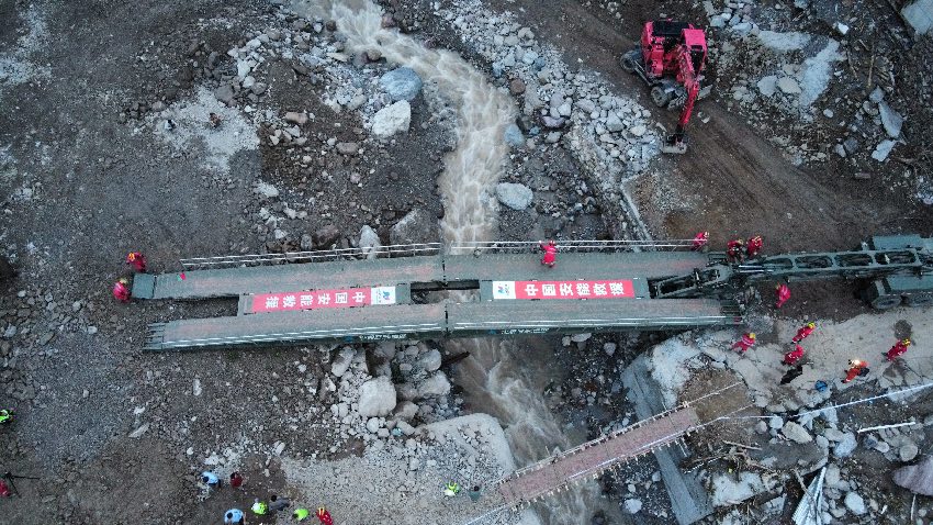 原本的石橋損壞后,救援隊伍用木板搭了一座臨時橋。7月21日晚上8點15分,就在受損的豆腐石橋位置,中國安能三局成功架設(shè)起一座應(yīng)急機械化橋,解決了救援人員和重型機械通行問題,為后續(xù)人員搜救和應(yīng)急保障提供了有力支撐。接下來,更多的大型機械將開進救援現(xiàn)場,搜救失聯(lián)人員、排危除險、消殺等工作仍在繼續(xù)。