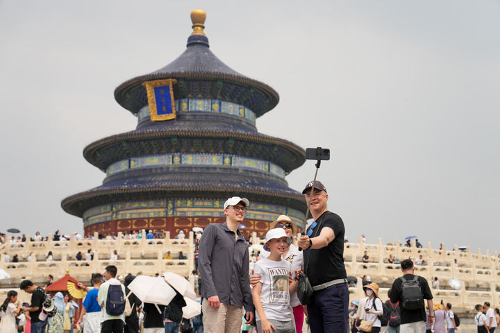 四名來(lái)自瑞士的游客在北京天壇公園祈年殿前合影(2024年7月9日攝)。