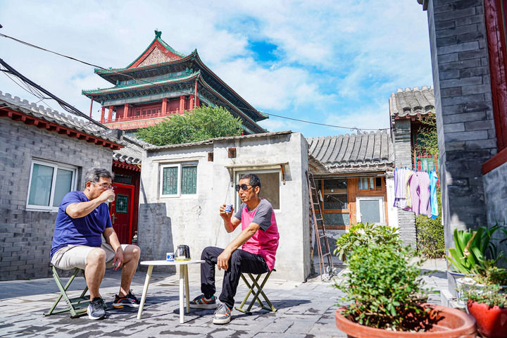 在北京鐘鼓樓下的鐘樓灣胡同里,市民在自家院子里喝茶(2023年6月12日攝)。