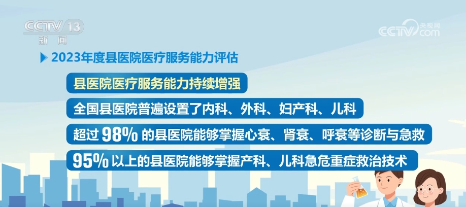 央視網(wǎng)消息:國家衛(wèi)生健康委29日通報(bào)了2023年度縣醫(yī)院醫(yī)療服務(wù)能力評(píng)估情況,全國共有2062家縣醫(yī)院參與醫(yī)療服務(wù)能力第三方評(píng)估,縣域覆蓋率達(dá)到98.6%。評(píng)估顯示,全國有91.85%的縣醫(yī)院符合基本標(biāo)準(zhǔn),也就是相當(dāng)于達(dá)到二級(jí)醫(yī)院能力,其中符合推薦標(biāo)準(zhǔn)達(dá)到三級(jí)醫(yī)院能力的占比超過一半。