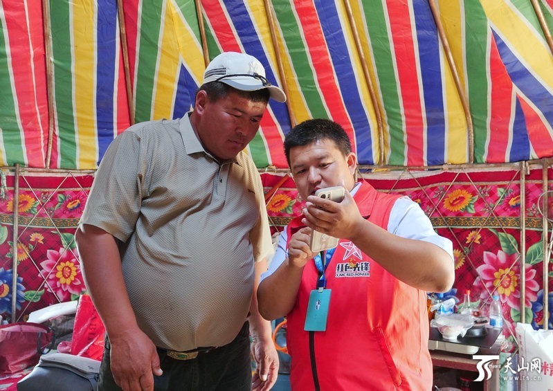 工作人員給牧民木拉提·畢木拉介紹用手機(jī)連接“智慧項(xiàng)圈”后的使用方法。周偉杰 攝