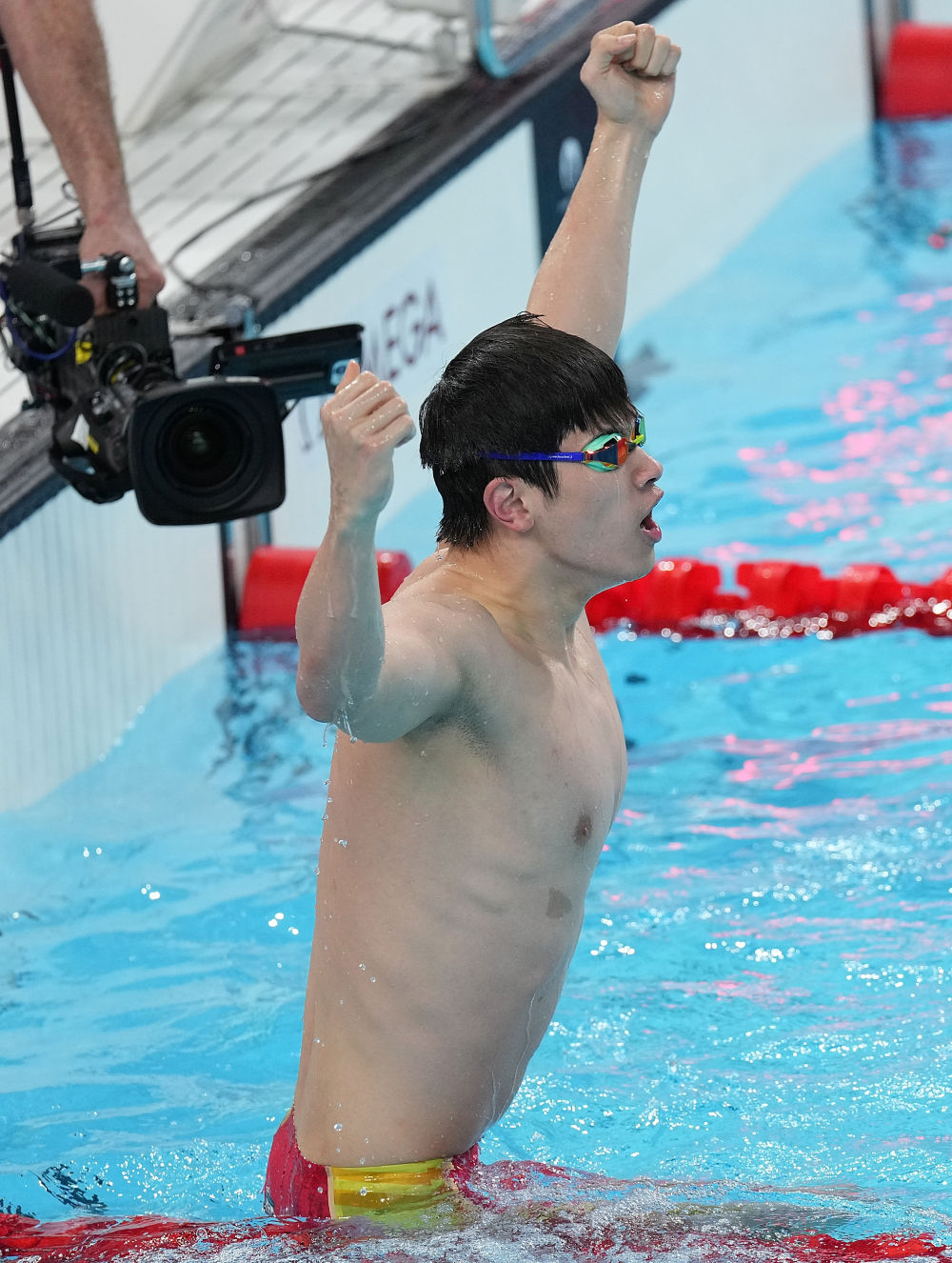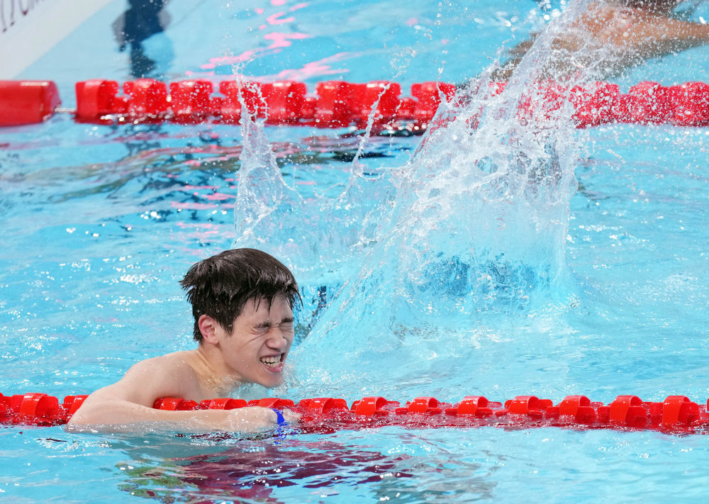 ↑中國(guó)選手潘展樂(lè)在比賽后慶祝。