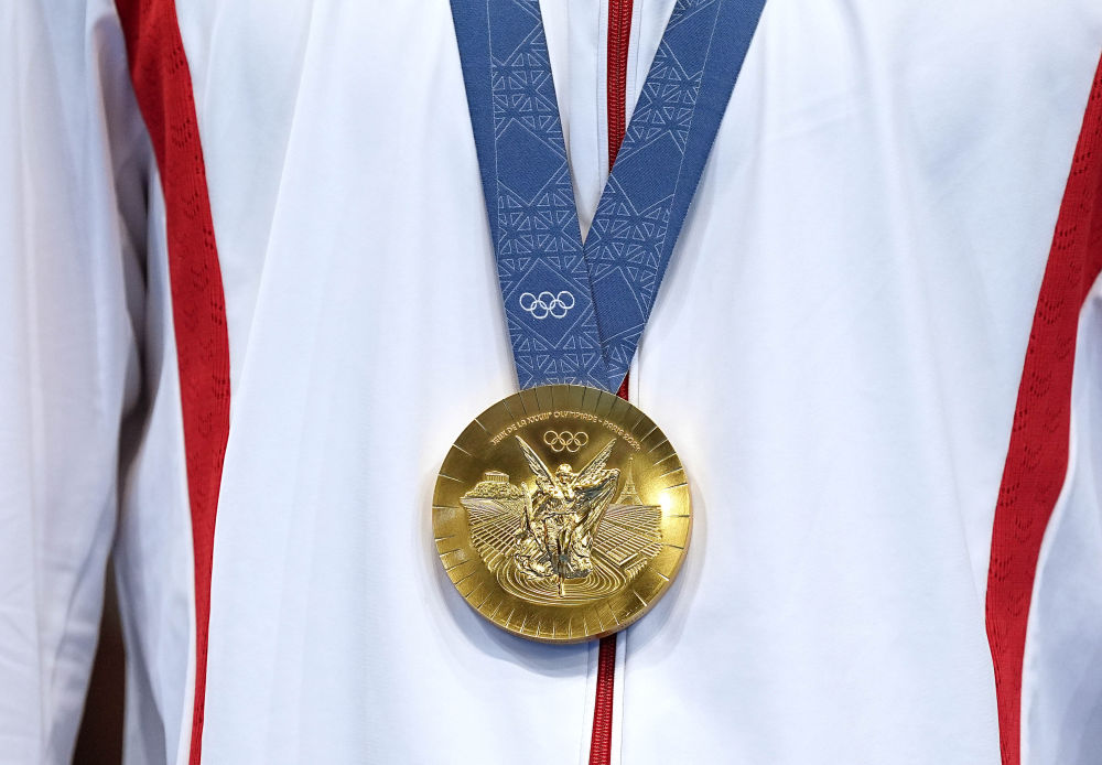 ↑這是7月31日拍攝的中國(guó)選手潘展樂(lè)獲得的金牌。新華社記者 杜宇 攝