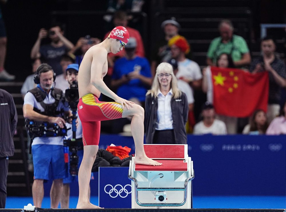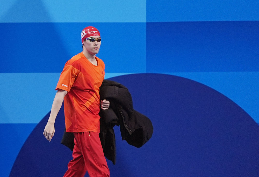 ↑中國(guó)選手潘展樂(lè)在比賽前入場(chǎng)。